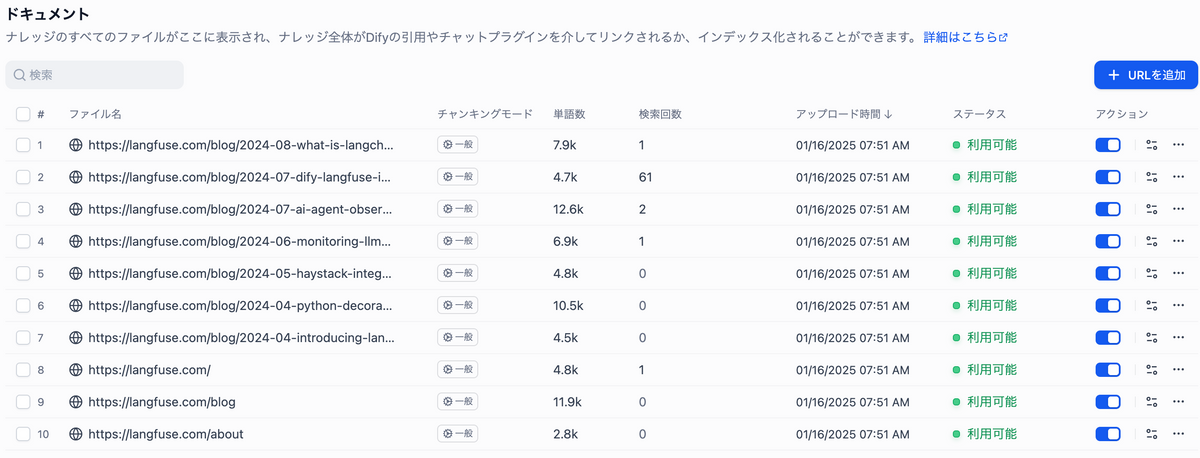(余談ですが、特定のフォルダ以下をとるような処理はDify上では正常に動いていないと思われ、トップページなどのURLもクロールしてしまいました。)