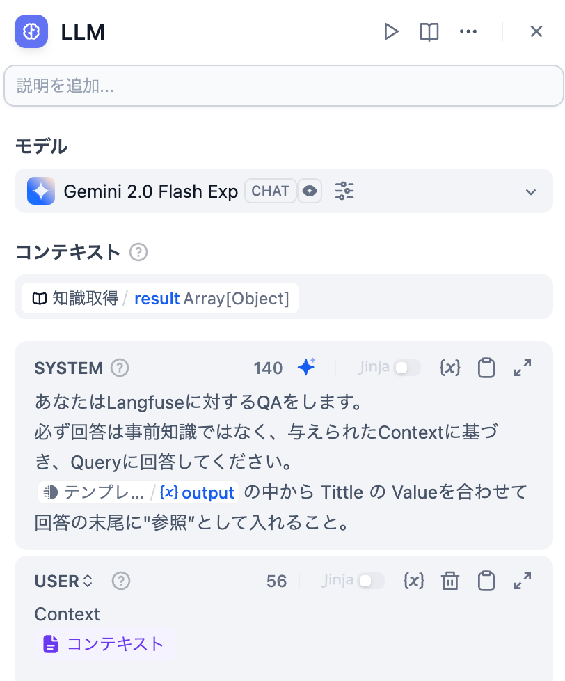 そしてLLMには 0の結果を含めて、処理を渡して個別に Metadata 中の Title のValueをアウトプットに含めるように指示しています。