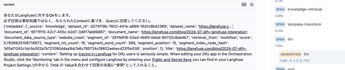 このようにLangfuse を活用することで、RAGのような処理が必要な際や特定の値をとってくる処理などをした際においても、Dify の各処理を確認しながら、効率的な開発・運用を進めることができます。今回は正常にデータが取れていましたが仮に期待した結果でない場合に、取得元のソースが違うのかなどのdebug にも大変役に立ちます。