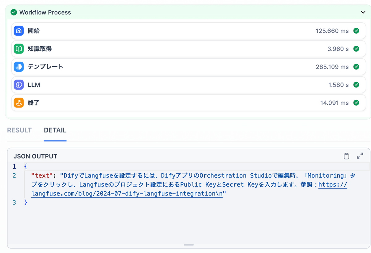 入力Text として 「Dify でLangfuse の設定をする方法を教えて」と質問すると、前述の処理を経て、Result として設定方法をコメントしつつ参照したURLを返してくれるという仕様です。