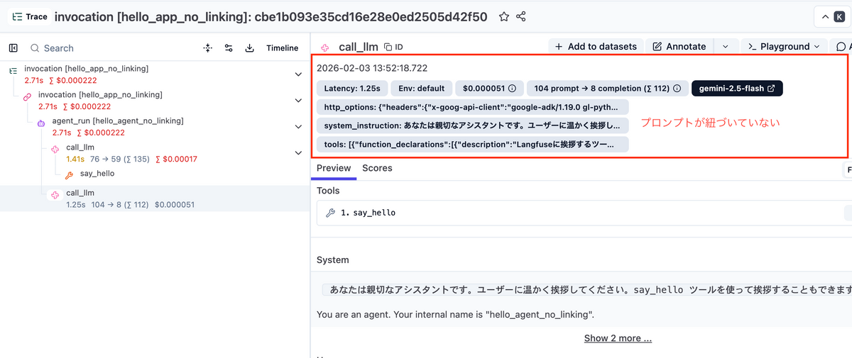 from openinference.instrumentation.google_adk import GoogleADKInstrumentorGoogleADKInstrumentor().instrument()しかし、これだけではプロンプト紐付けがされません。